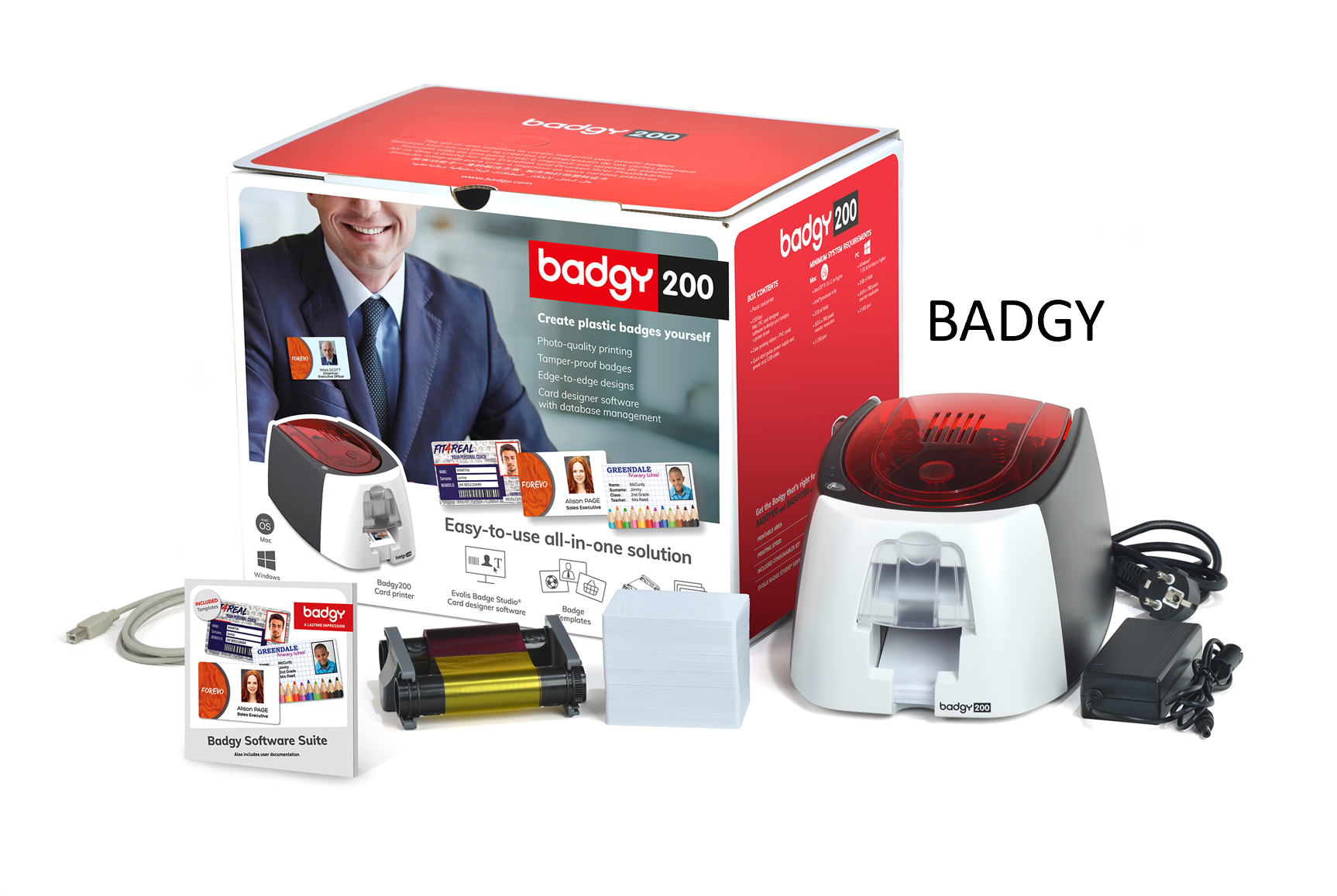 The Evolis Badgy200 is a bundle supplied with software, 100 cards and a colour ribbon.